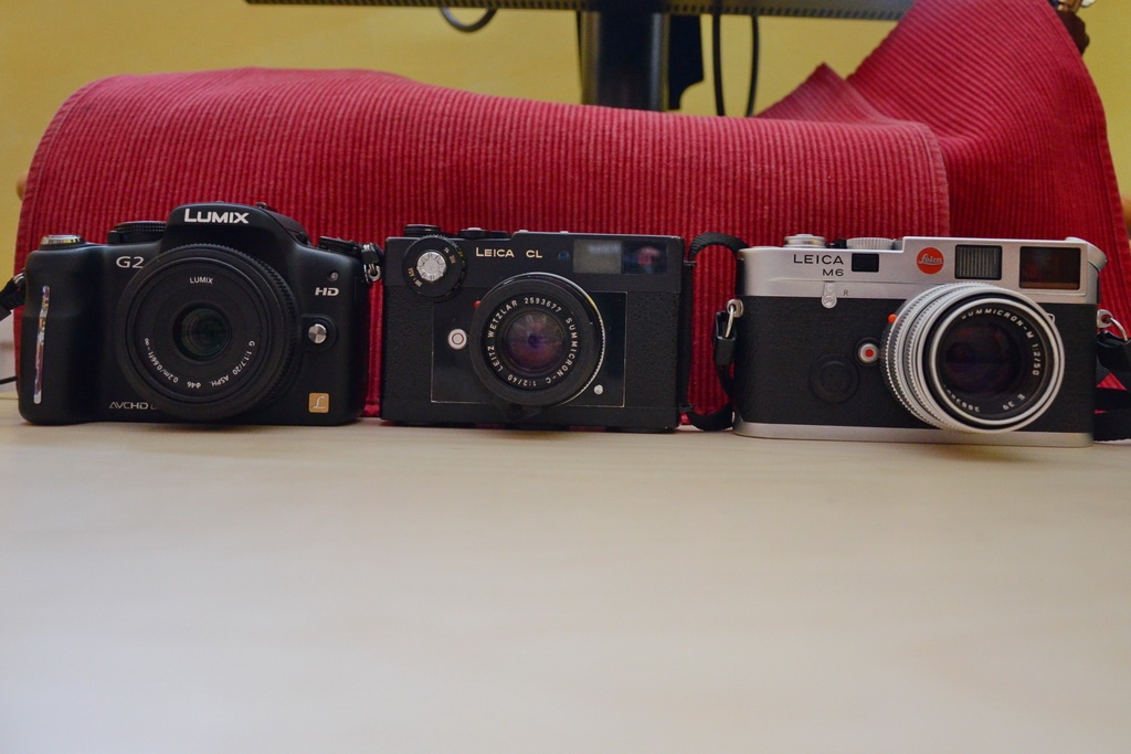 Hier auf dem Foto von 2011 sieht man in Kameras zusammengefaßt meinen Übergang vom analogen ins digitale Zeitalter: